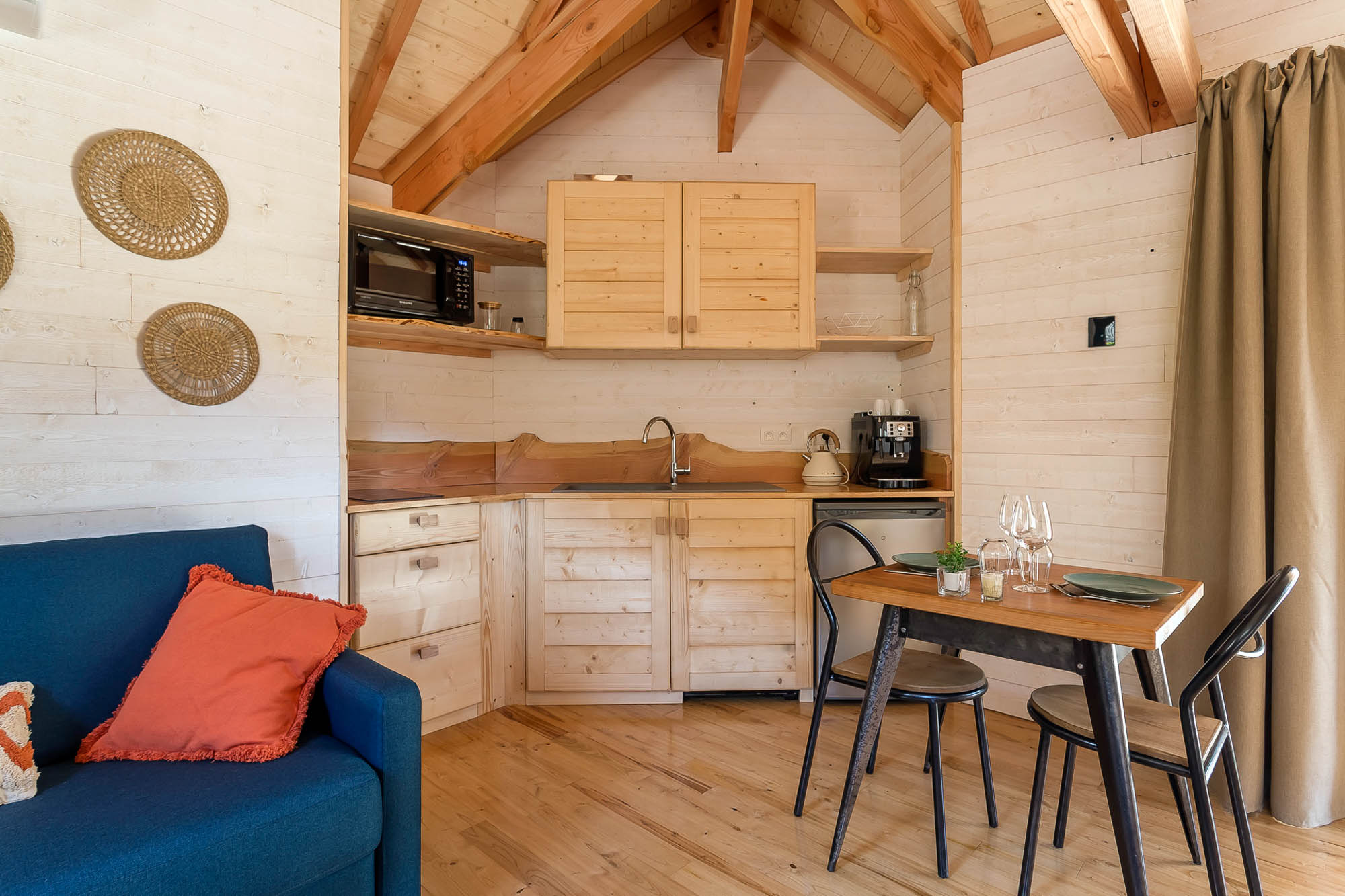 BookBuilt at a height of 3.5 m, accessible by a staircase, facing south, this cabin with its luxurious equipment and bohemian decoration offers you a warm interior where natural materials and shimmering colours are combined. From the terrace you can admire the river, enjoy the jacuzzi and the sauna with a view of the surrounding nature in complete privacy.